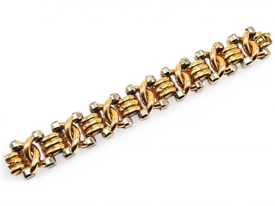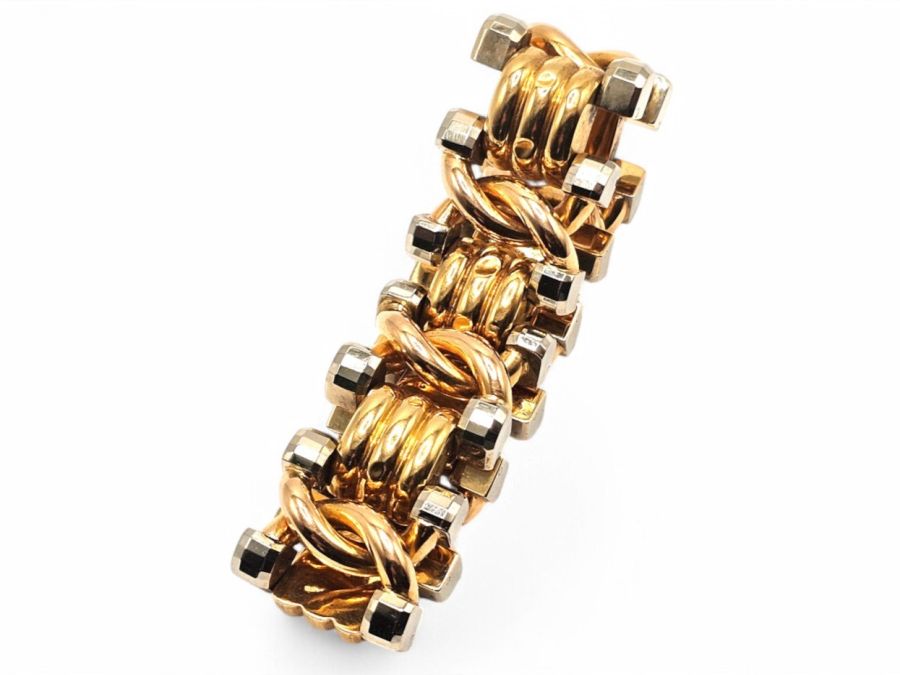 Bracciale tank in oro Anni '40 maglie articolate, concatenate, a motivo di...