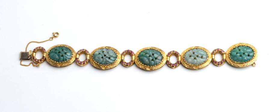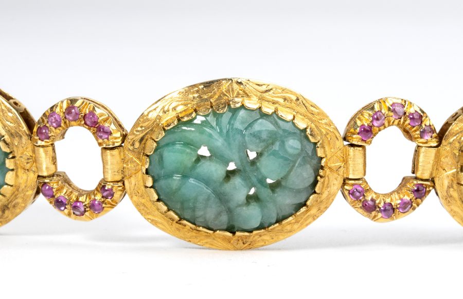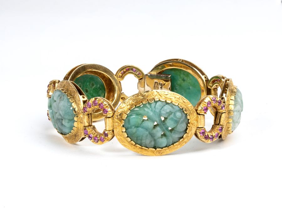 in oro giallo 18k, con maglie ovali incastonate con giade incise a motivi floreali, allacciate a maglie ad anello incastonate con rubini.
