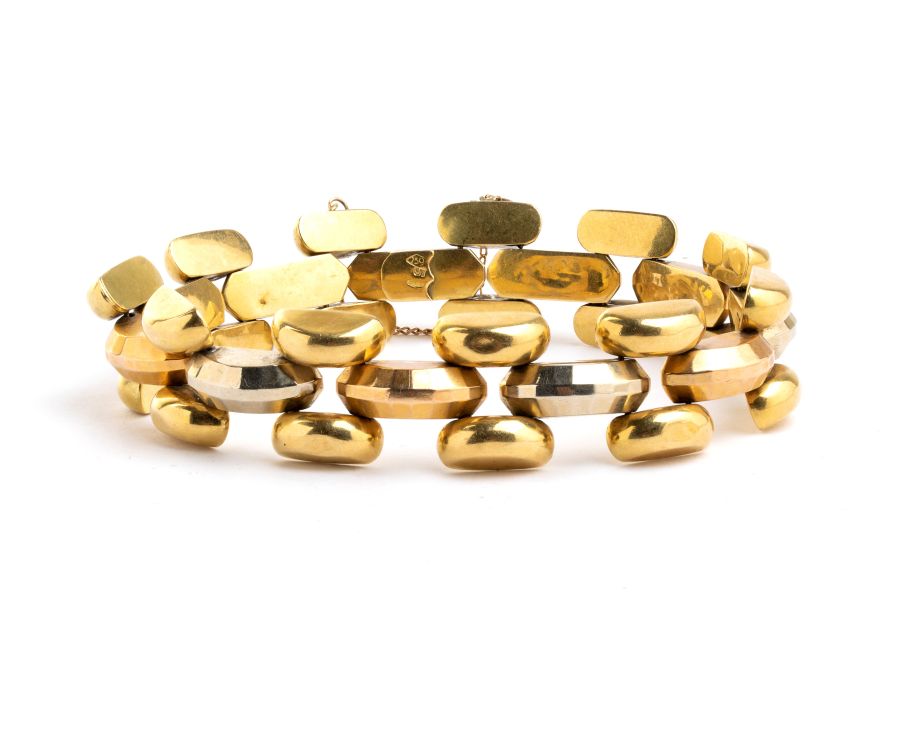 Lot 206 | Bracciale in oro Anni '40 modello tank, in oro giallo, bianco e rosa 18k....