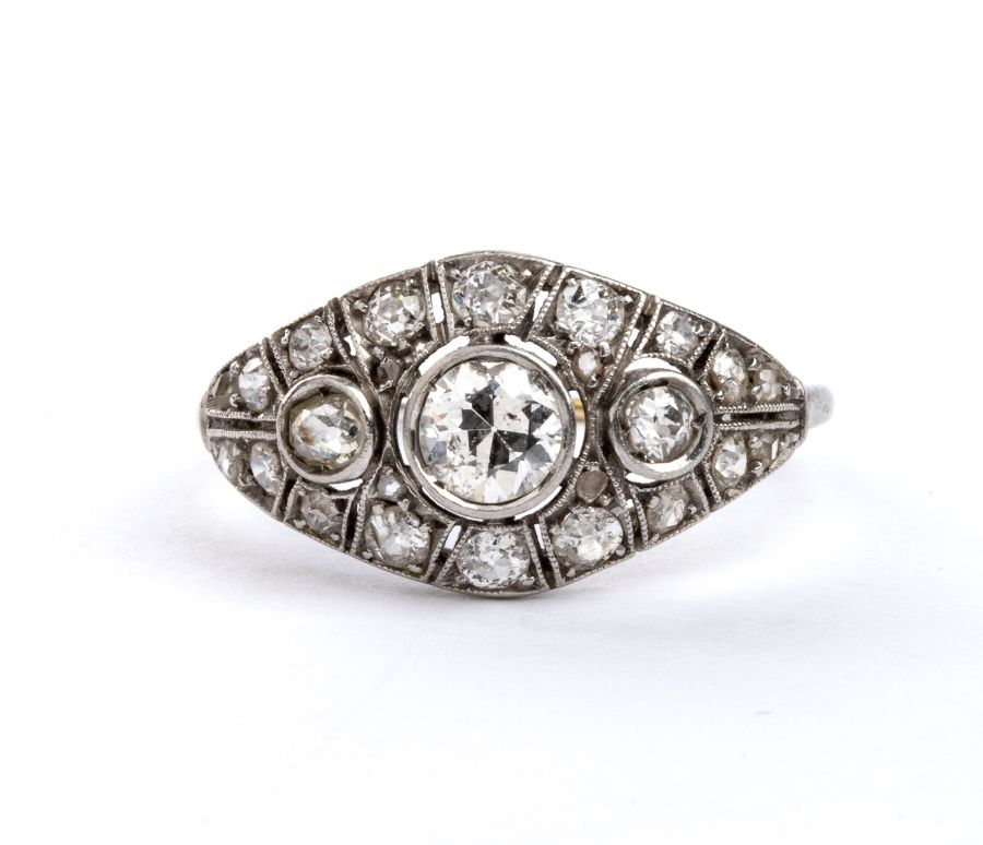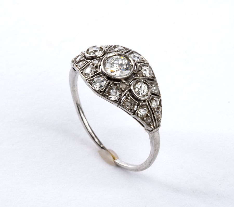 Demi-parure composta da spilla a barretta e anello, in platino e diamanti Anni '30