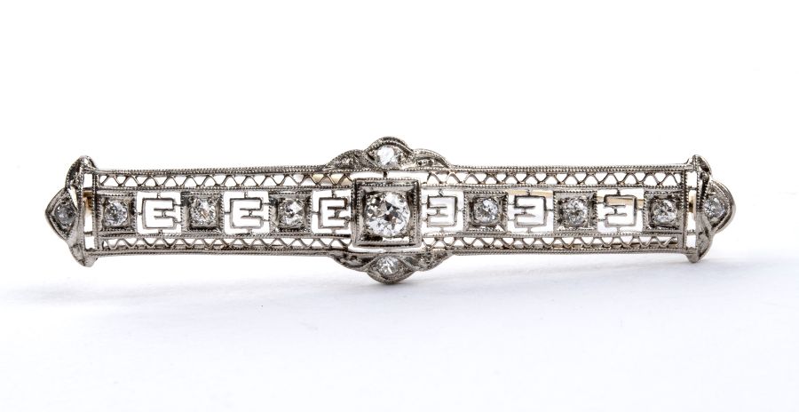 spilla a barretta traforata ed anello impreziositi da diamanti.
