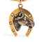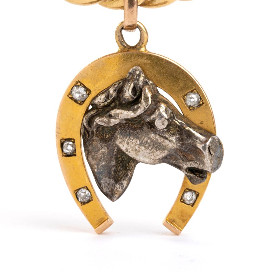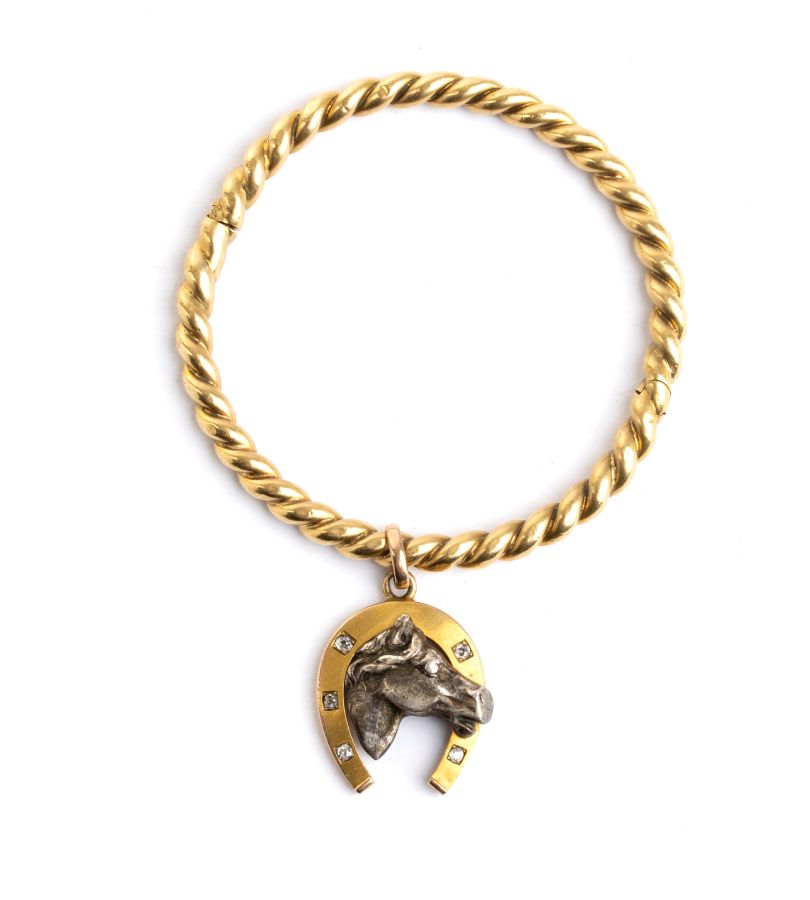 in oro giallo 18k, a cerchio rigido con motivo a cordonetto, a cui è sospeso un pendente scaramantico raffigurante un ferro di cavallo, decorato con piccoli diamanti, e la testa di un cavallo in argento.