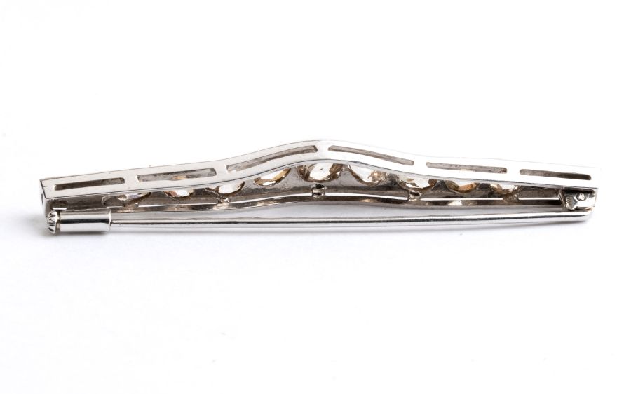 Spilla in oro e diamanti Anni '30 in oro bianco, di forma a barretta,...