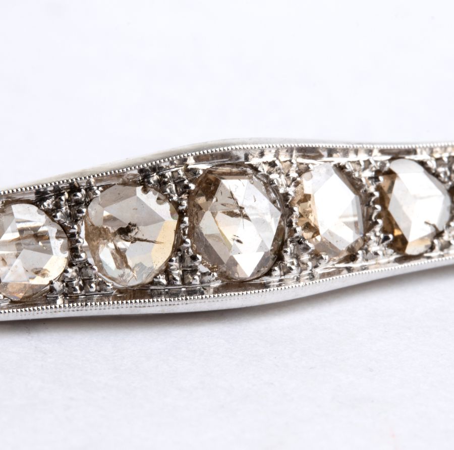 in oro bianco, di forma a barretta, incastonata con linea di diamanti taglio a rosa.