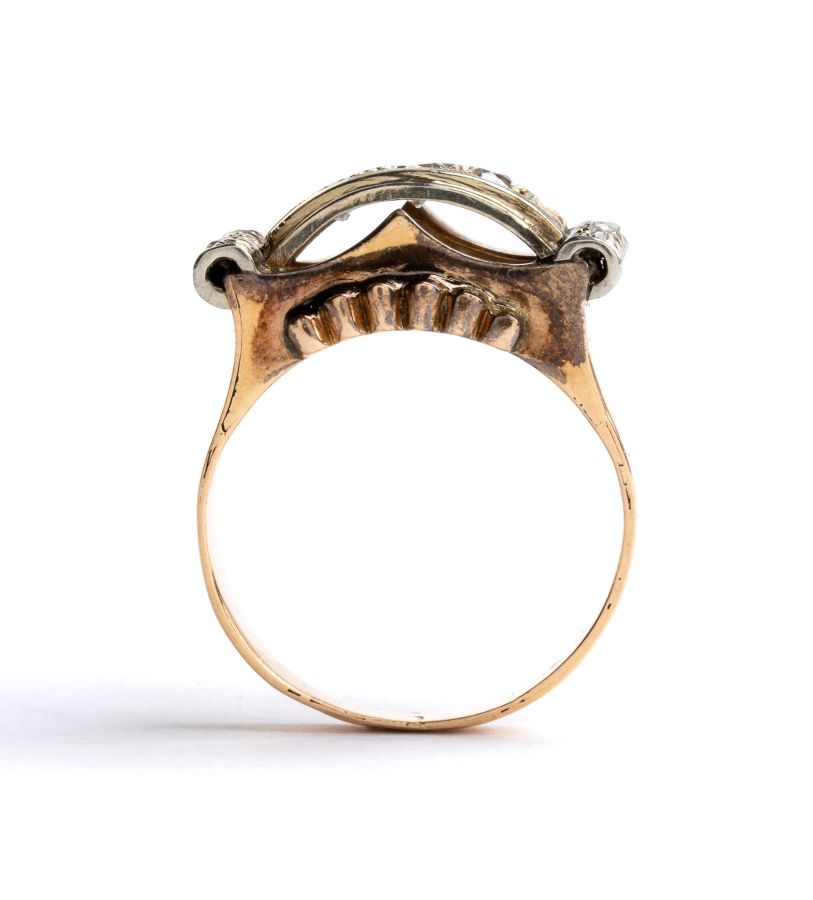 con motivo a volute in oro giallo ed oro bianco 18k, incastonato con diamanti taglio huit-huit, taglio a rosa e taglio old mne.
