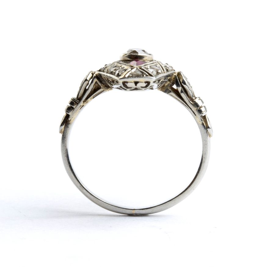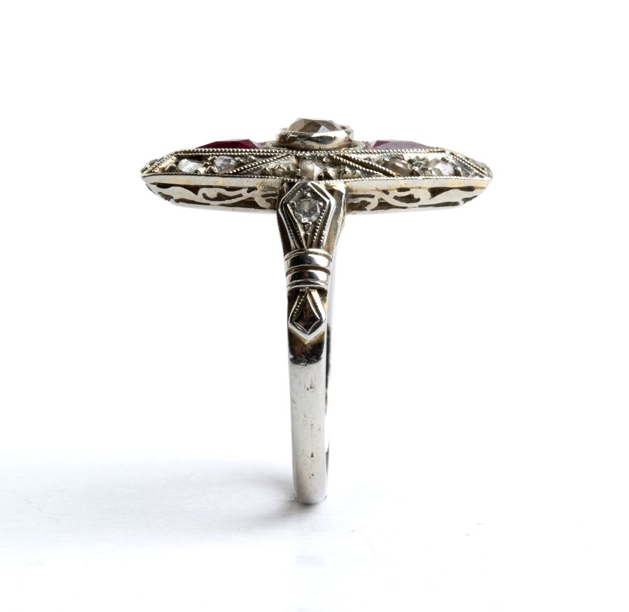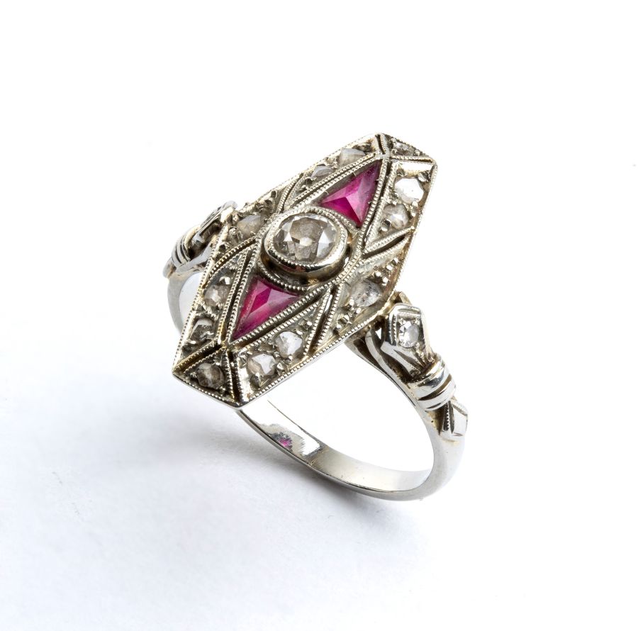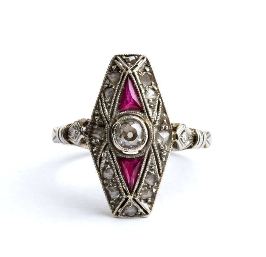 Lot 231 | Anello in oro con diamanti e rubini Anni '20 in oro, di forma geometrica,...