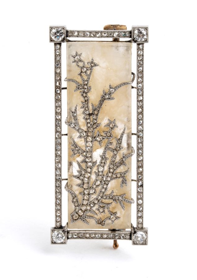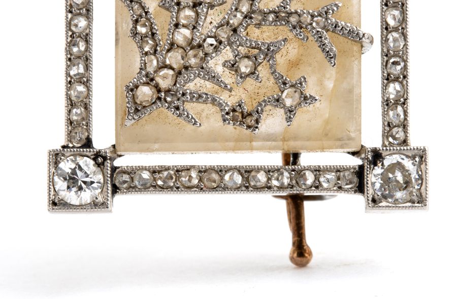 di forma geometrica, con lastra in cristallo di rocca, elementi floreali e cornice in diamanti taglio a rosa e taglio brillante.