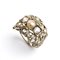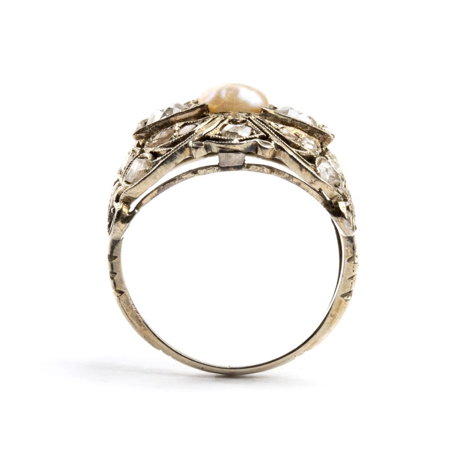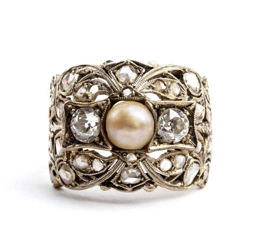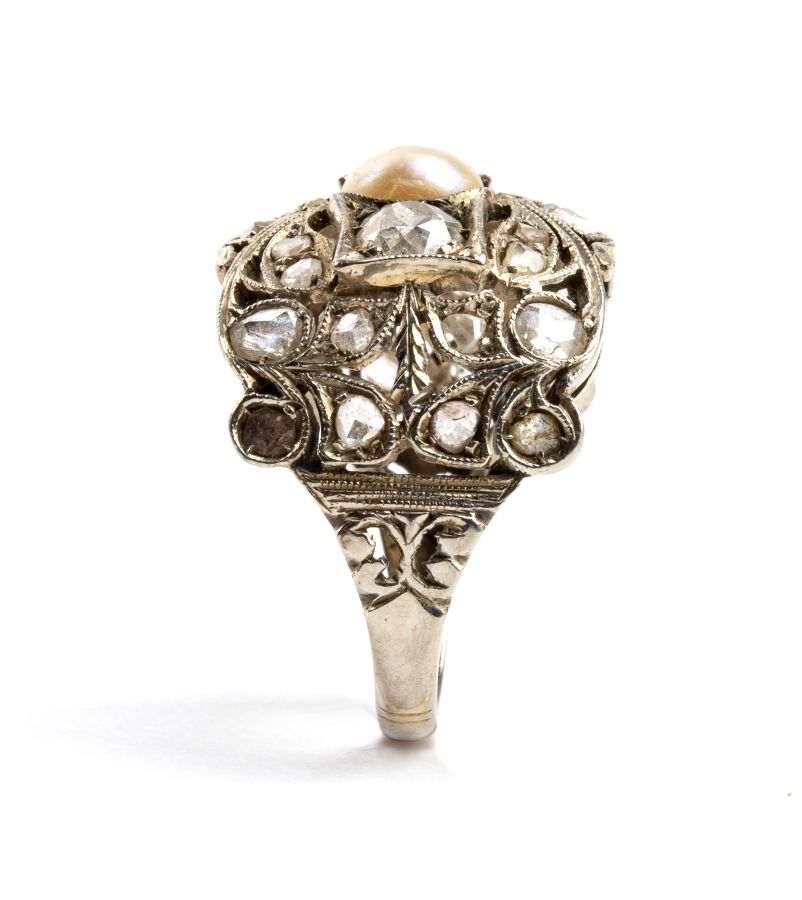 in oro bianco con montatura a fascia traforata di forma a motivi vegetali, impreziosita da una perla centrale, diamanti taglio vecchia miniera e taglio a rosa.