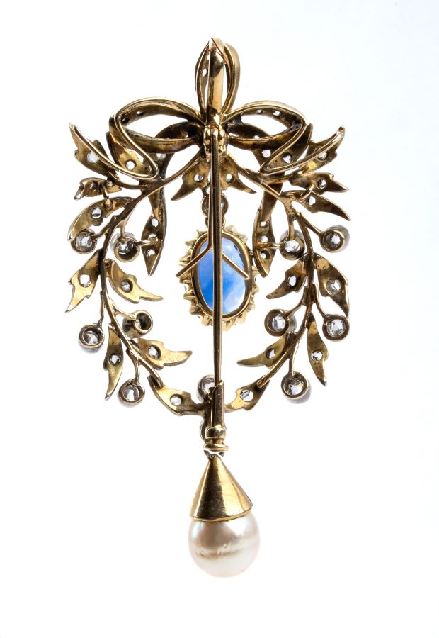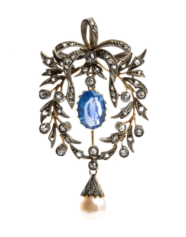 argento ed oro giallo, in stile ghirlanda a motivi vegetali e nastri in diamanti taglio a rosa e taglio vecchia miniera, uno zaffiro sintetico ed una perla coltivata d'acqua salata pendenti.