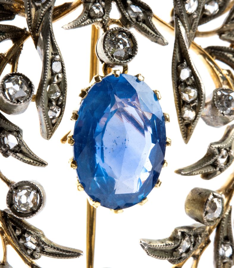 Spilla in argento e oro con zaffiro sintetico e diamanti fine XIX secolo