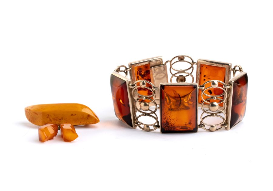 bracciale in oro bianco, con maglie geometriche incastonate con ambroide (ambra trattata); spilla in metallo con ambra baltica intagliata a forma di zoccoli olandesi.