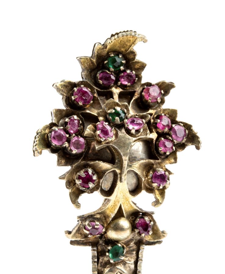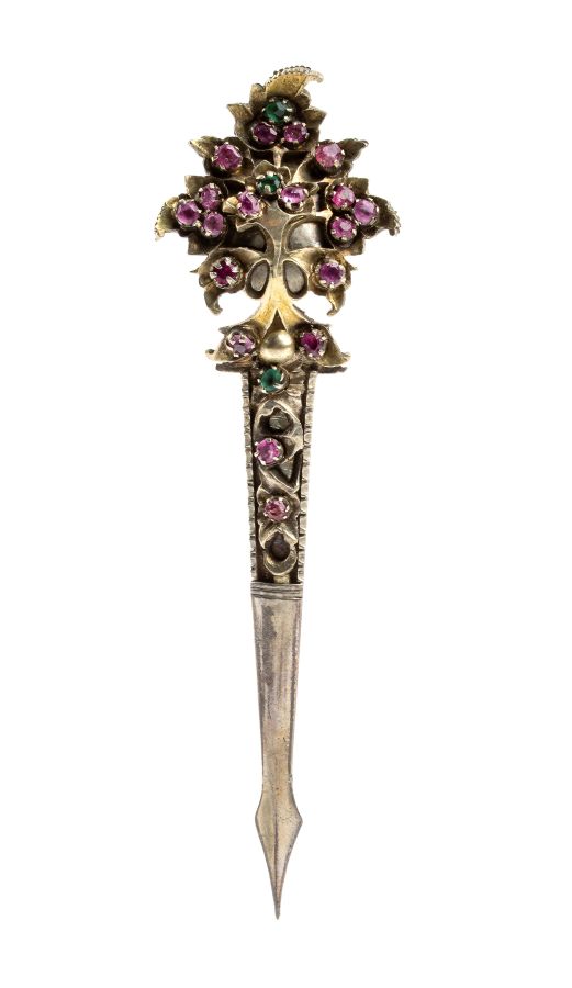modello a spadino in oro giallo ed argento, con motivo floreale in rubini e smeraldi.