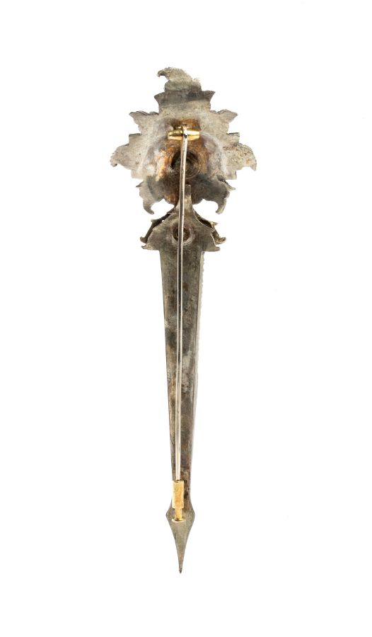 Spilla in oro ed argento con rubini e smeraldi modello a spadino in oro...