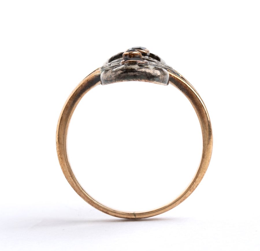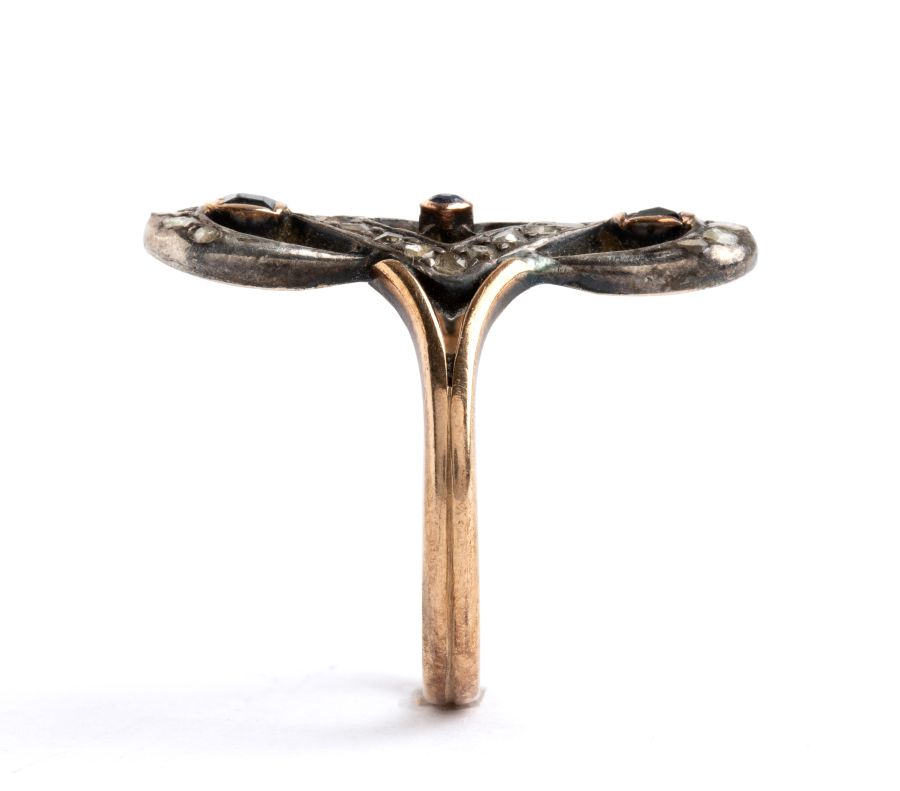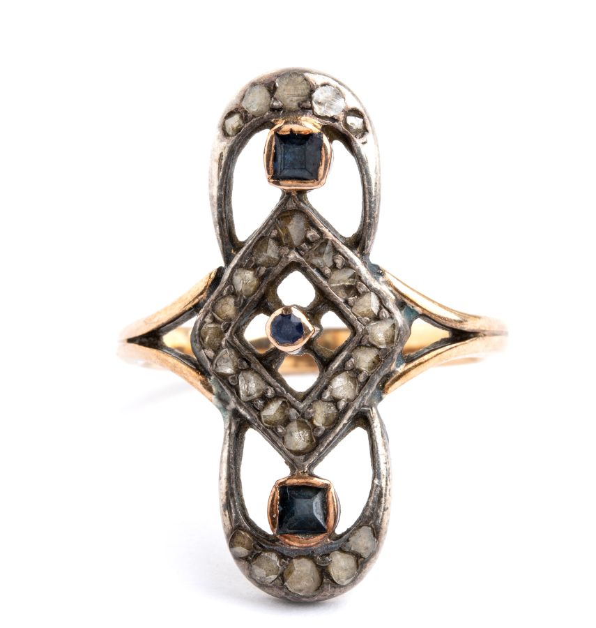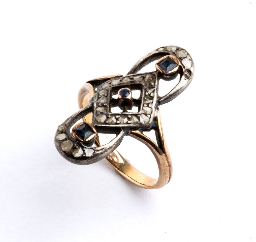 Anello in oro e argento con diamanti e zaffiri inizio XX secolo