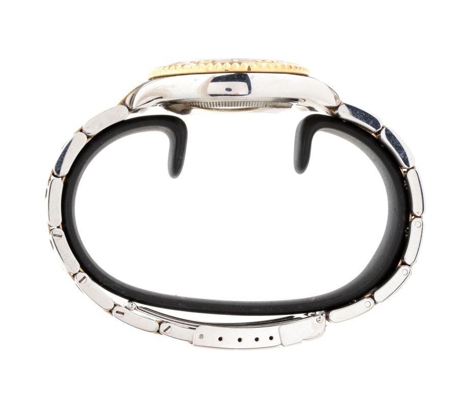 con cassa e bracciale in acciaio e oro, quadrante blu con indici e sfere dorate con materiale luminescente bianco. Movimento meccanico automatico, calibro 2235 con rimessa rapida dal datario e vetro zaffiro, lunetta girevole bidirezionale. Referenza 168623, matricola P596771.