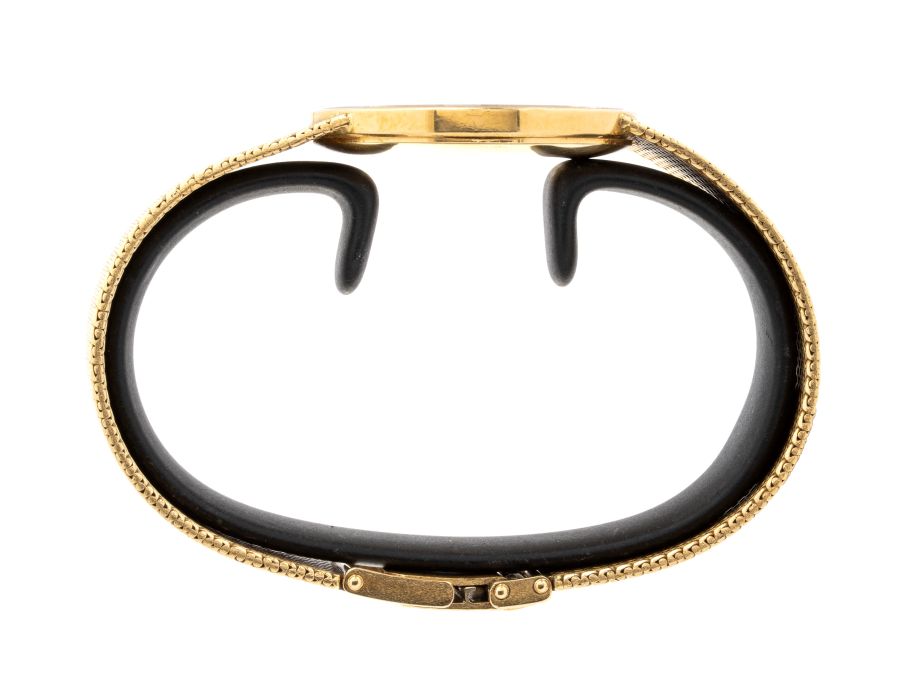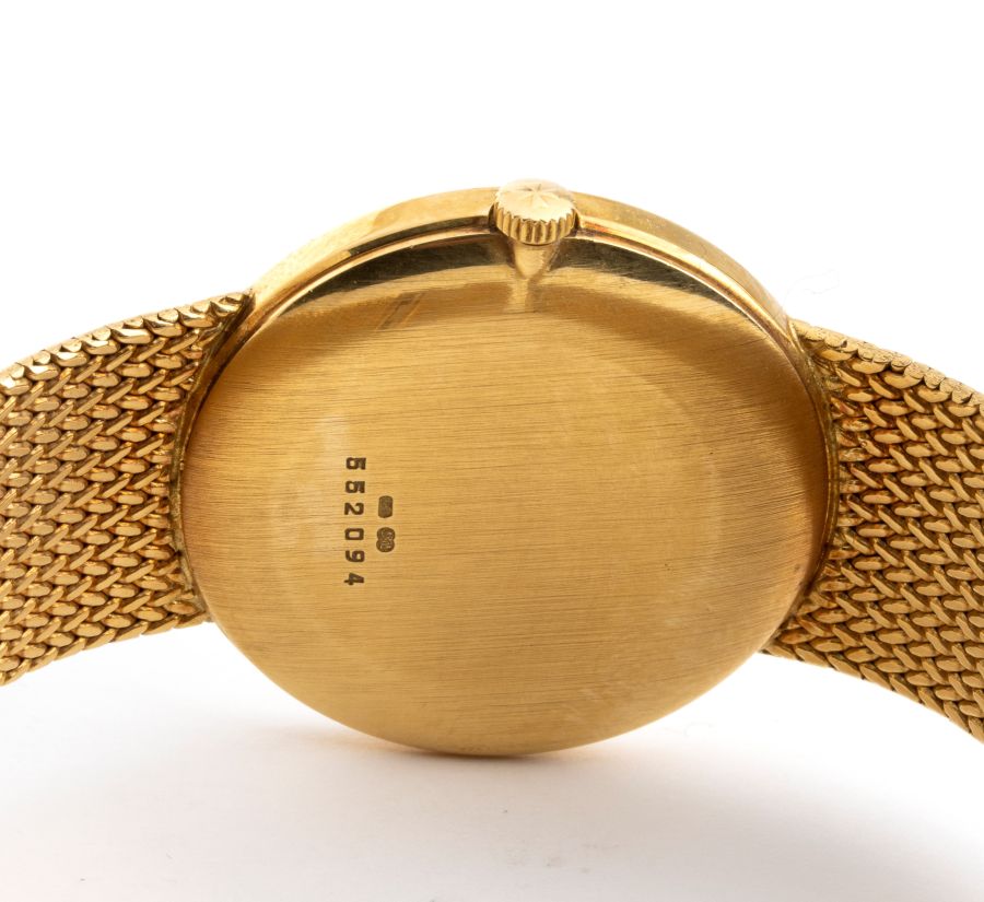 cassa e bracciale integrato in oro 18kt, quadrante champagne con indici romani. Movimento ultrapiatto a carica manuale. Calibro 1015, referenza 39009, matricola 55294.