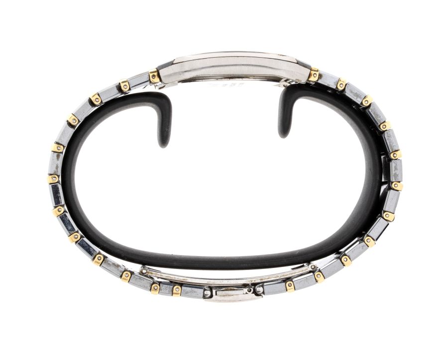cassa e bracciale in metallo con parti in metallo dorato. Movimento al quarzo.
