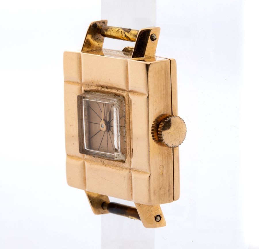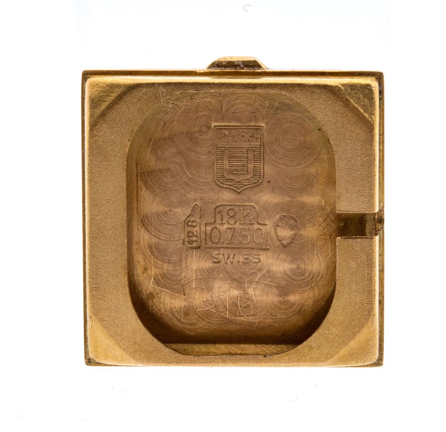 di forma quadrata, cassa in oro, movimento manuale. Calibro 501, referenza 155129-1, matricola 1948022.
