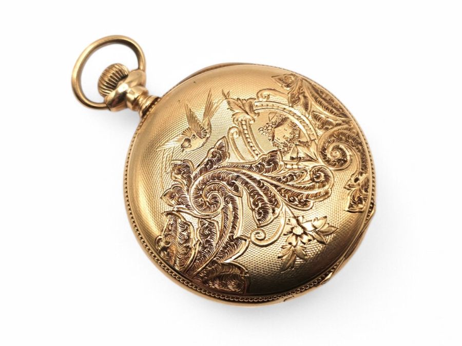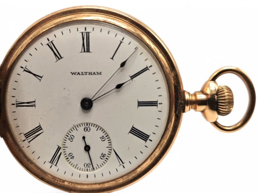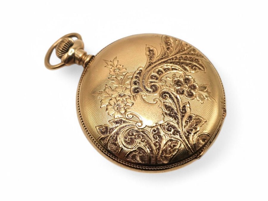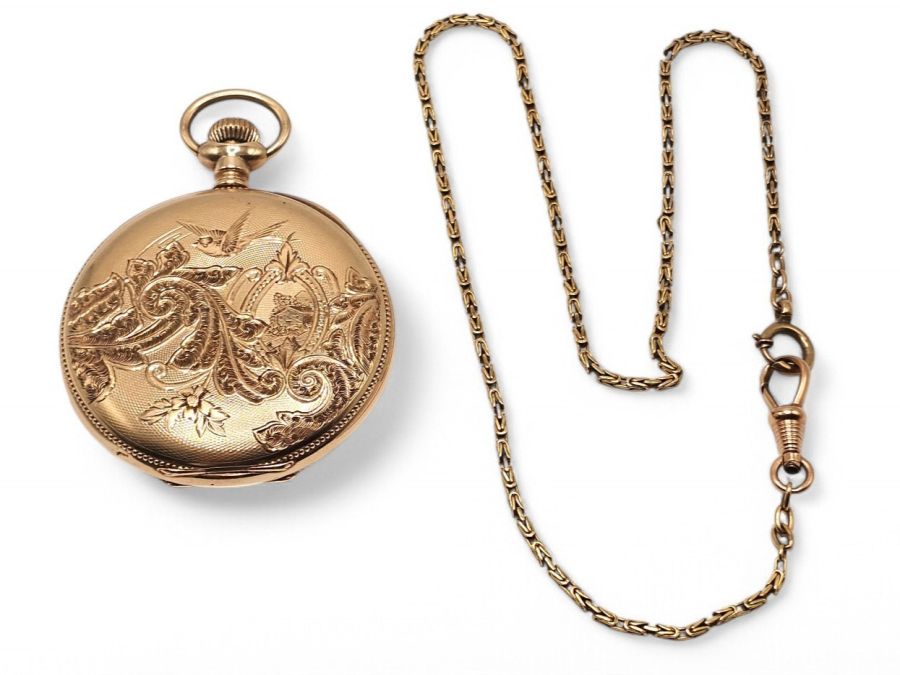 cassa in oro giallo 14k, quadrante bianco con indici romani e lancetta dei secondi con lunetta a ore 6. Movimento a carica manuale. Firmato WALTHAM. Lavorato sul retro con decorazioni floreali. Dotato di catena in oro a basso titolo.