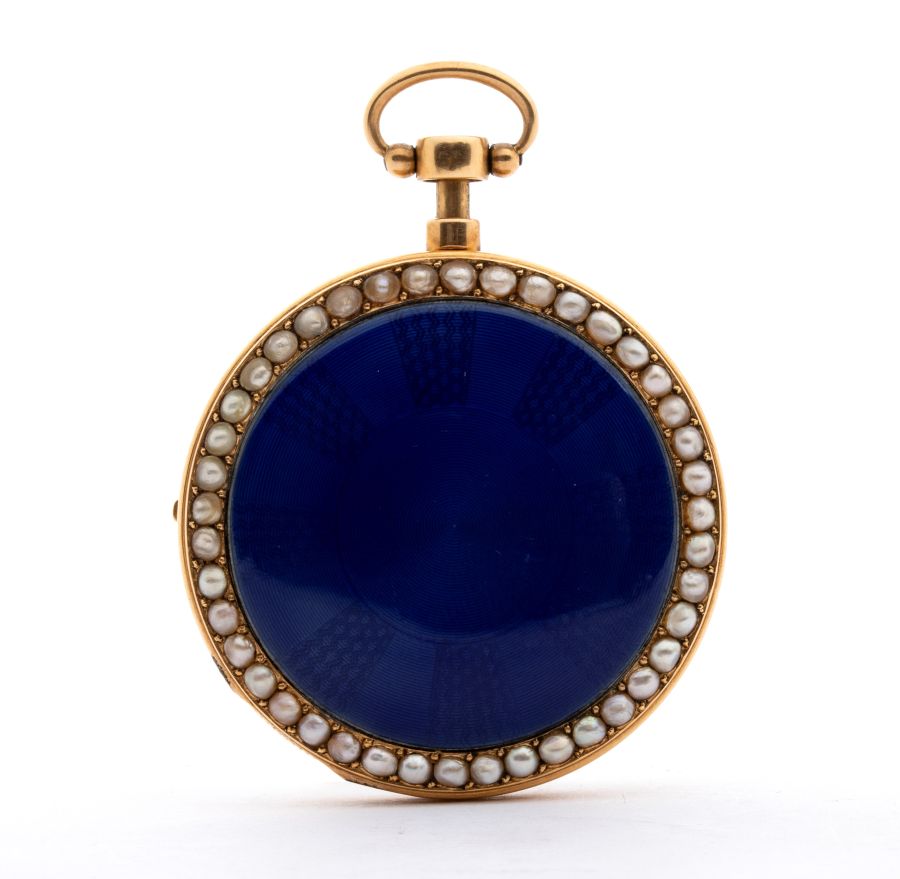 cassa in oro, retro smaltato in blu e decorato con microperle, quadrante bianco e oro con numeri arabi. Movimento a scappamento a cilindro, orologio con ripetizioni. Seriale 83373.