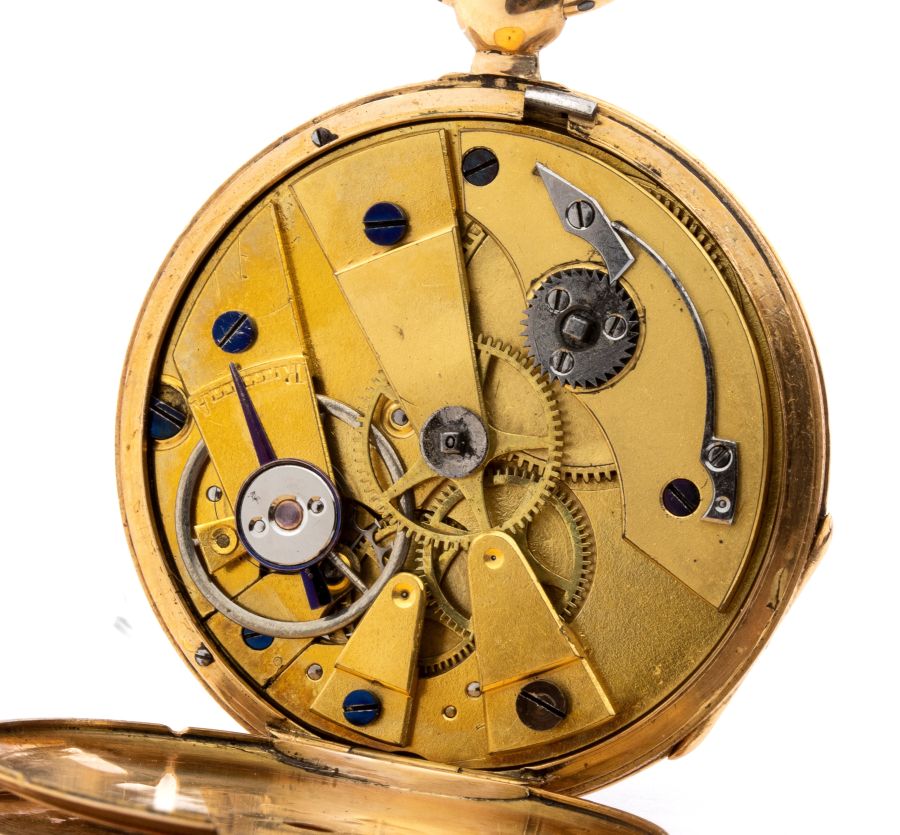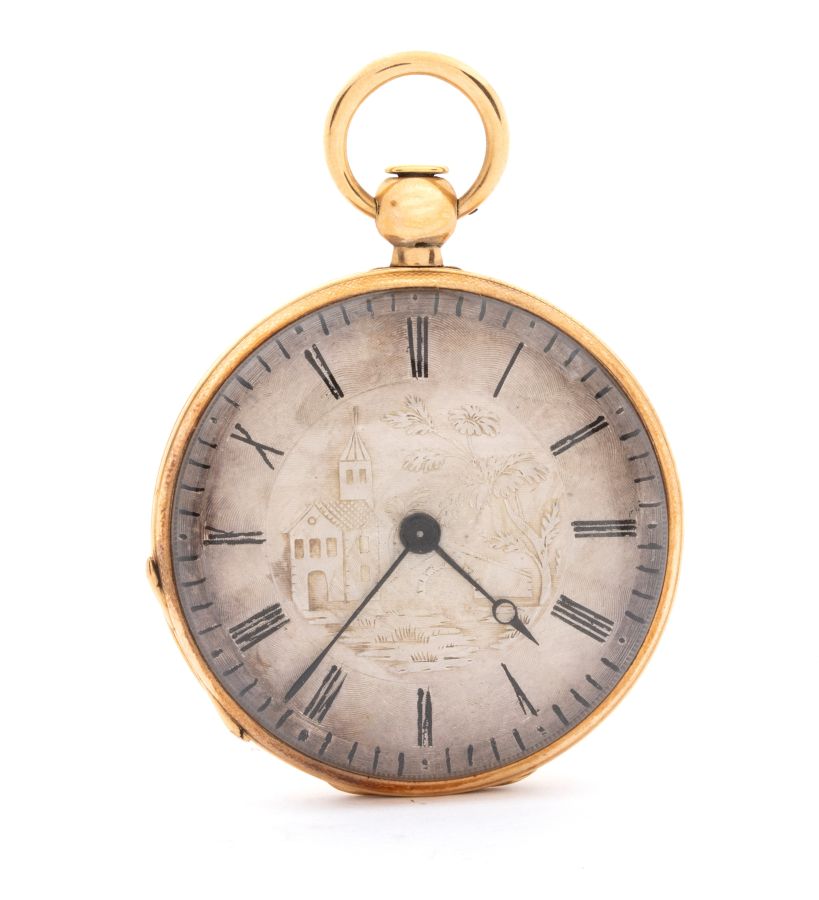 Orologio da tasca in oro cassa in oro, quadrante decorato inciso con indici...