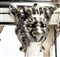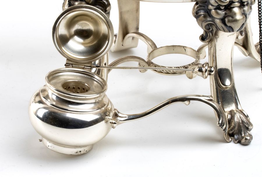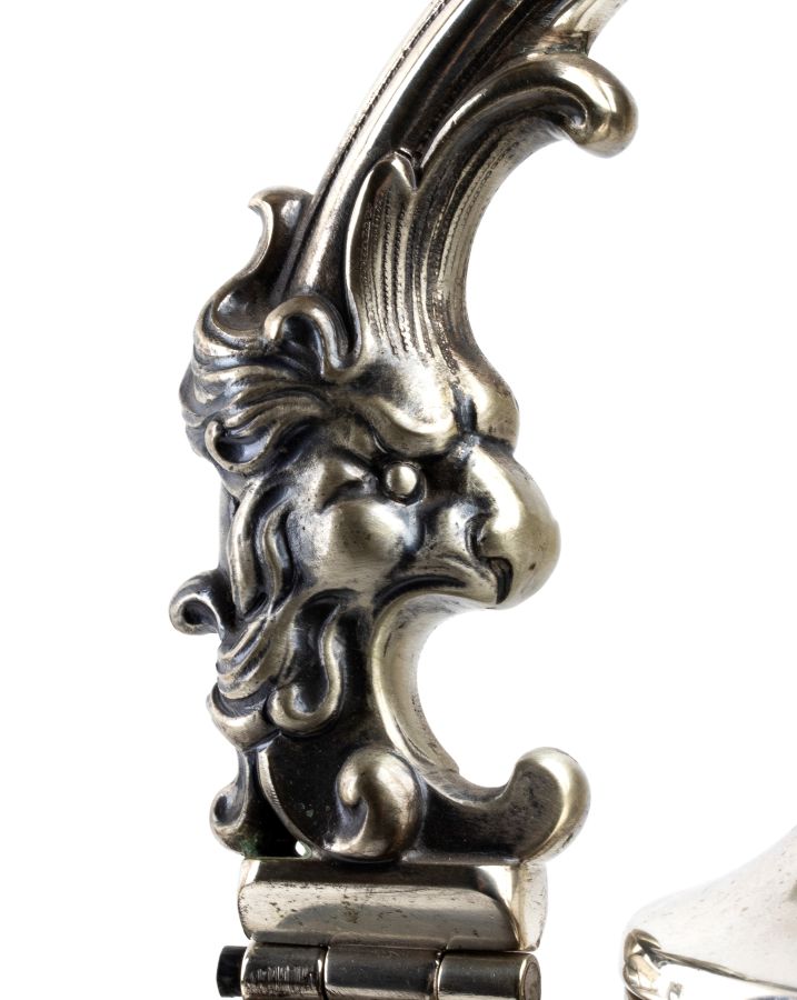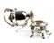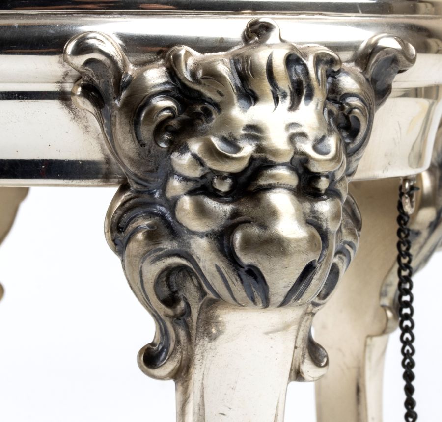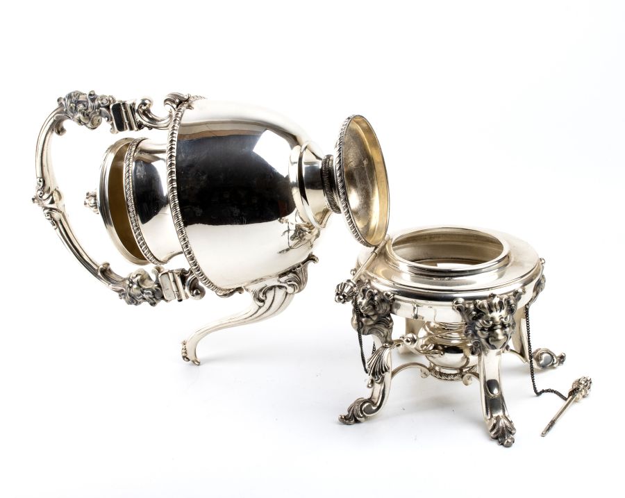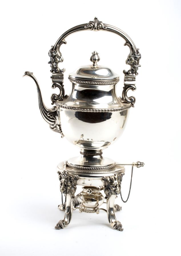 Altezza x larghezza x profondità: 54 x 30 x 21 cm; Peso lordo complessivo: 3880 gr. Altezza x larghezza x profondità: 54 x 30 x 21 cm; Peso lordo complessivo: 3880 gr. di grandi dimensioni, poggianti su quattro piedini decorati con elementi vegetali e quattro teste leonine, motivi presenti anche nel manico; corpo liscio, bordi San Marco, dotato di due perni di sicurezza per tenere salda la teiera sulla base. Dotato di fornellino decorato con motivi vegetali stilizzati.