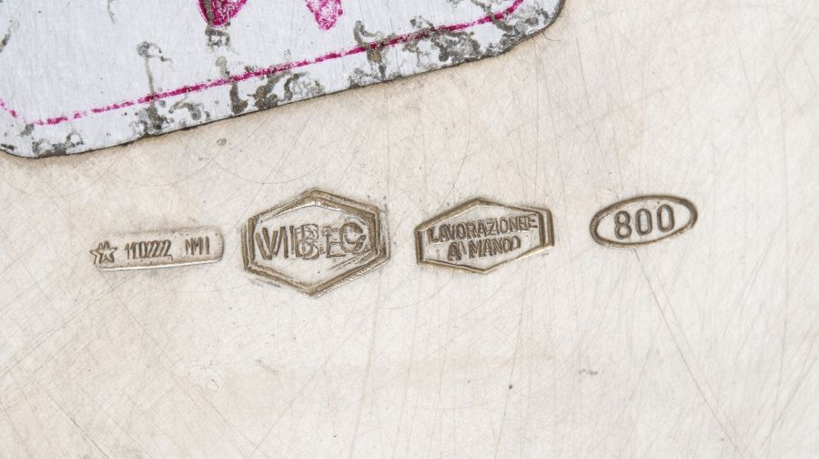 Argento 800/1000, punzonato "800" - "* 1022 MI" - "VIBEC" - "lavorazione a mano", argentiere VIBEC di Becci Liliana, Milano.