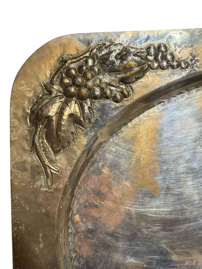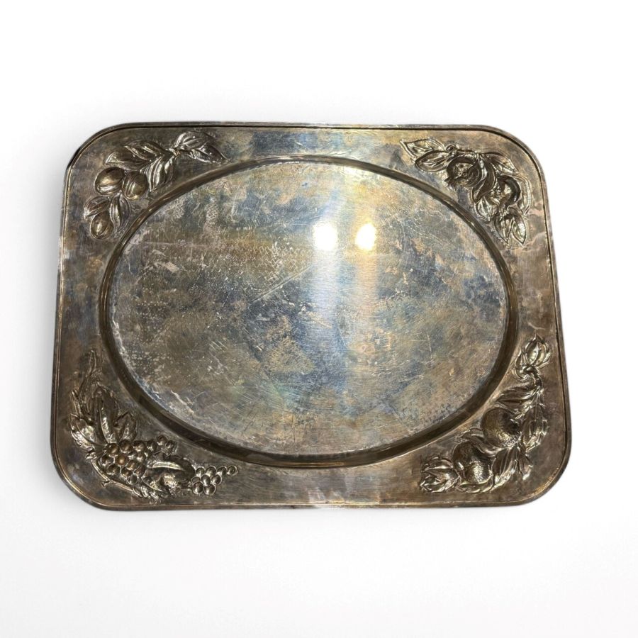 Larghezza x lunghezza: 50 x 39 cm. Peso: 2100 gr. Larghezza x lunghezza: 50 x 39 cm. Peso: 2100 gr. di forma rettangolare ad angoli smussati, decorato sugli angoli con motivi di frutti e foglie tipici dell'autore.