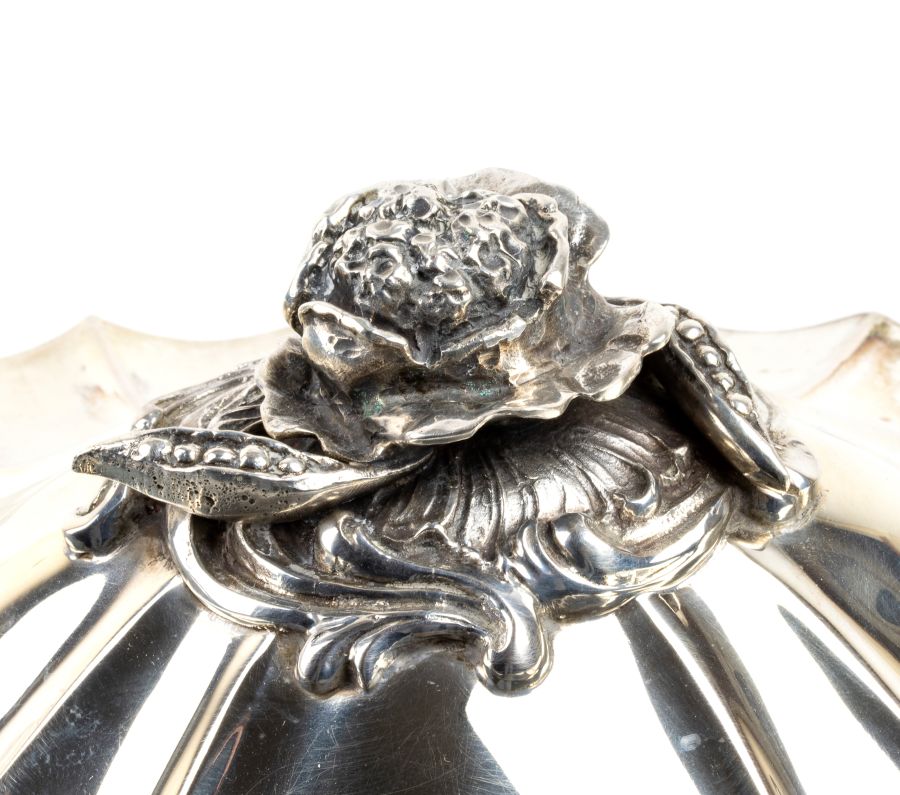 Altezza x larghezza x profondità: 24 x 35 x 20 cm. Peso: 2010 gr circa. Altezza x larghezza x profondità: 24 x 35 x 20 cm. Peso: 2010 gr circa. forma sagomata, poggiante su quattro piedini di forma leonina stilizzata, manici con elementi ripetuti di foglie e presa a forma di fiore.