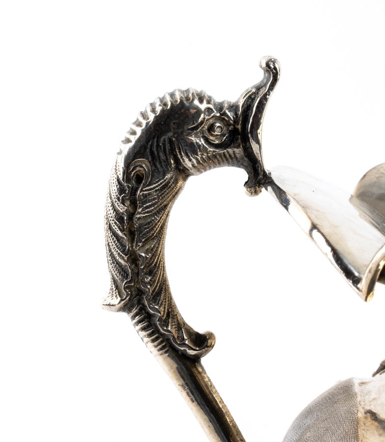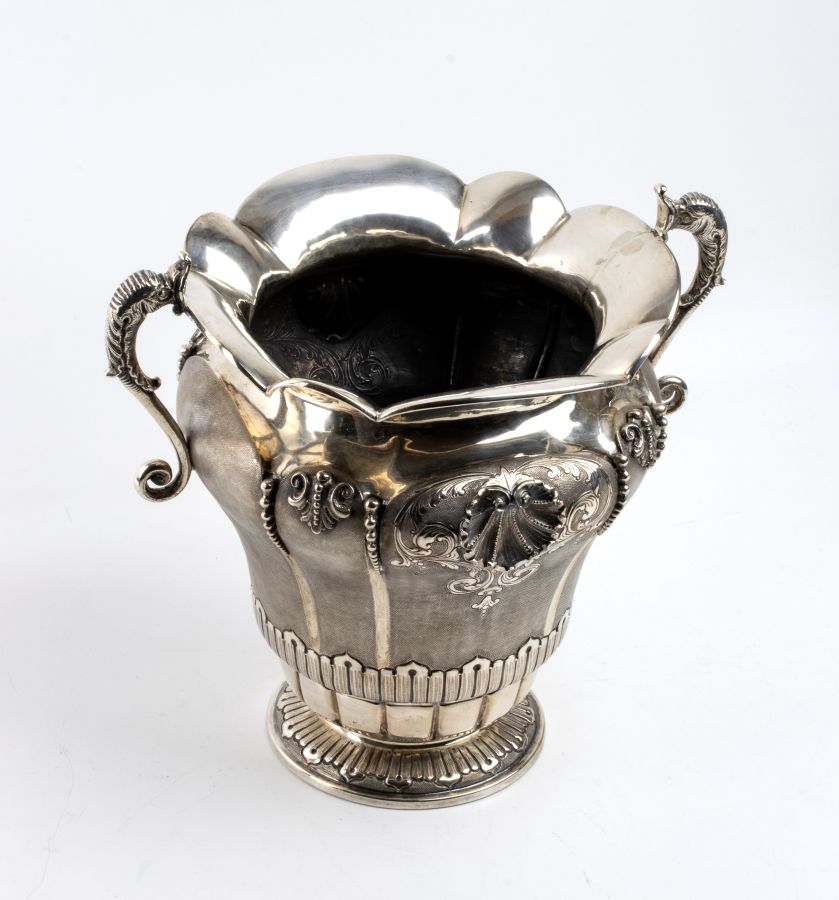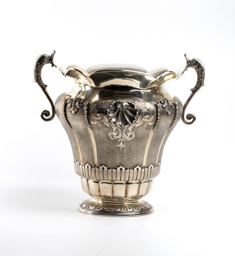 Altezza x larghezza x profondità: 29 x 28 x 24 cm. Peso: 1585 gr circa. Altezza x larghezza x profondità: 29 x 28 x 24 cm. Peso: 1585 gr circa. su base circolare, decorato con motivi floreali e conchiglie, sagomato e satinato; manici a forma di delfini stilizzati.