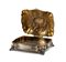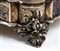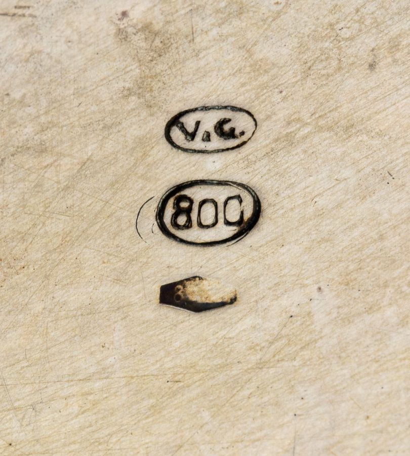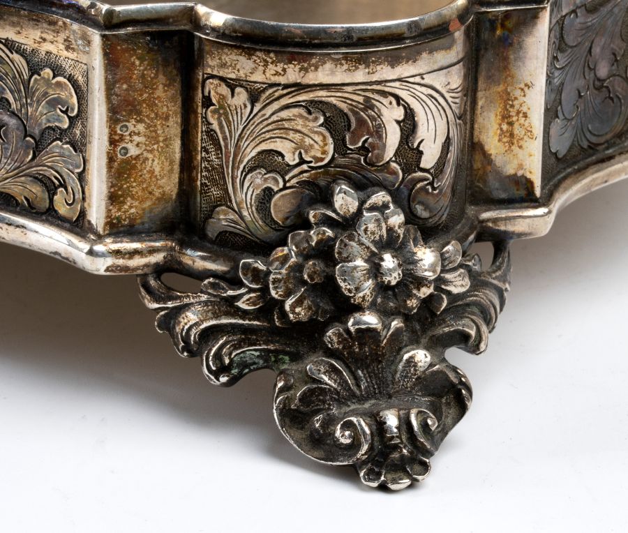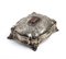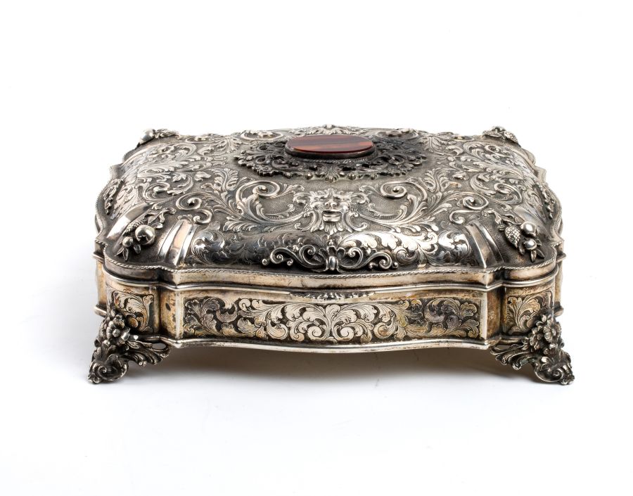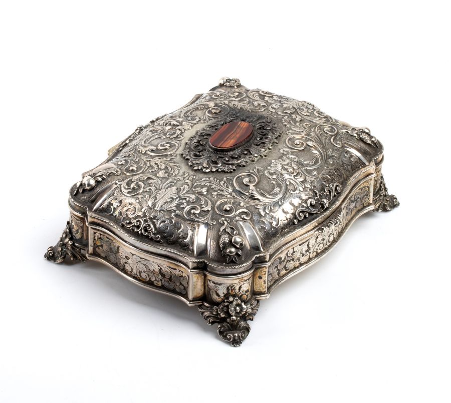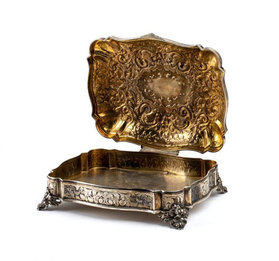 Altezza x larghezza x profondità: 26 x 20 x 9 cm. Peso lordo complessivo: 1410 gr circa. Altezza x larghezza x profondità: 26 x 20 x 9 cm. Peso lordo complessivo: 1410 gr circa. di forma quadrangolare, sbalzata e cesellata con motivi floreali, vegetali e mascheroni, interno a vermaille. Sul coperchio una pietra di forma ovale incastonata.