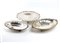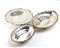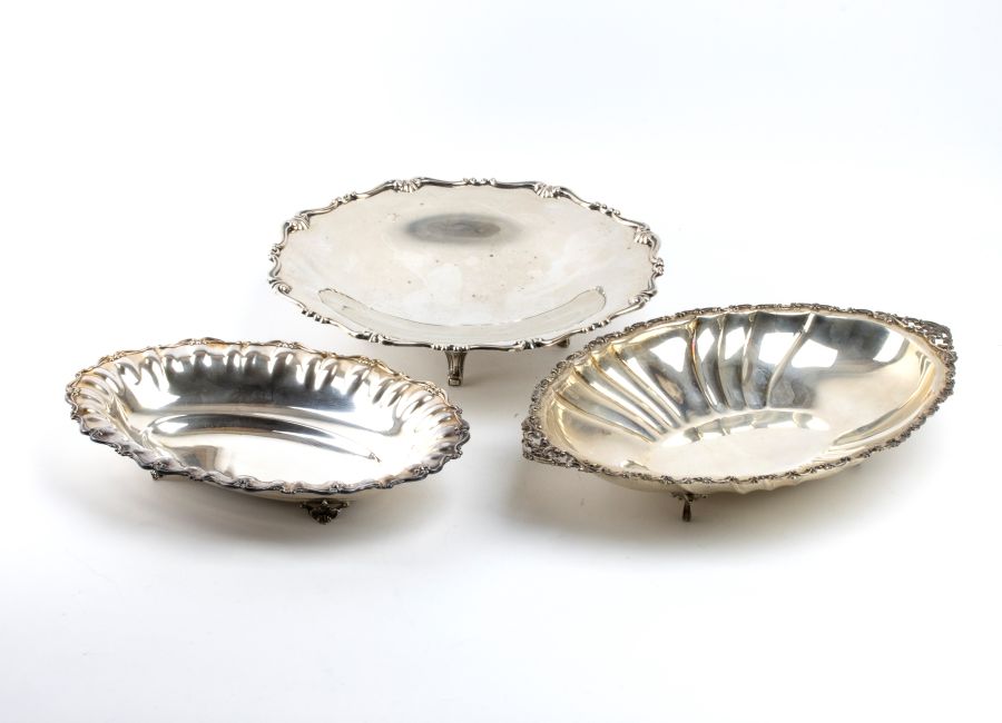 Peso complessivo: 1245 gr circa. Peso complessivo: 1245 gr circa. composto da tre cestini, due di forma ovale e uno di forma rotonda, tutti decorati sui bordi con elementi florali e motivi vegetali stilizzati e tutti e tre poggianti su piedini.