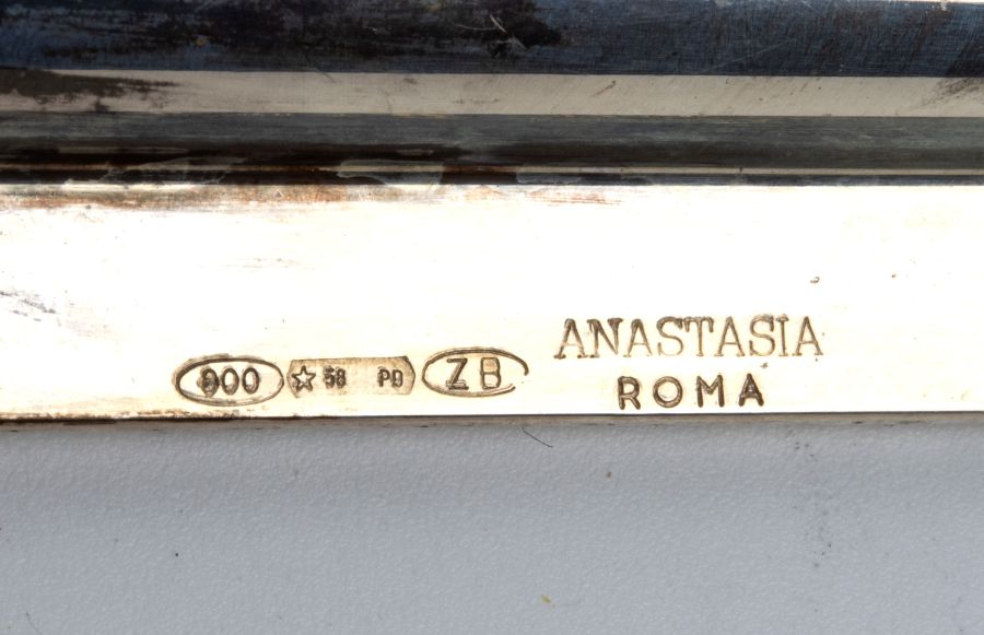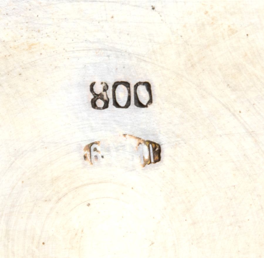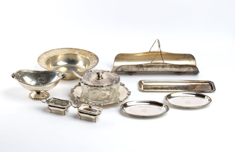 Peso lordo complessivo: 1500 gr circa. Peso lordo complessivo: 1500 gr circa. composto da elementi in argento 800/1000: un piatto rotondo con bordi sagomati, una coppia di saliere, una coppa, un portatovaglioli, un piatto rettangolare, una coppia di piatti ovali e una zuccheriera in vetro con piatto e coperchio in argento.