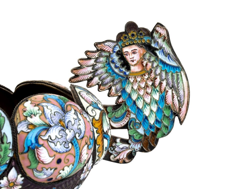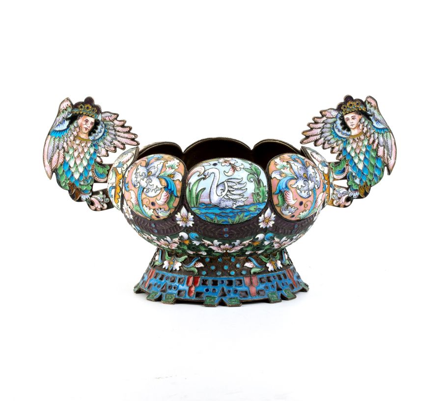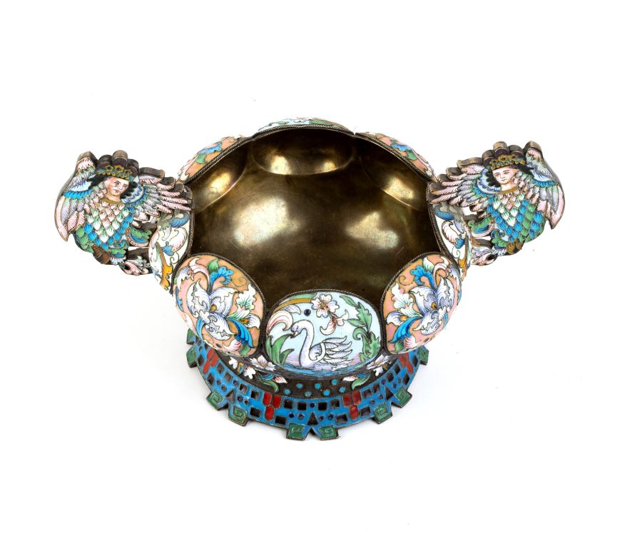 Ciotola russa a due manici in argento dorato e smalti Cloisonné XX secolo