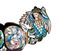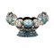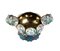 Altezza x larghezza x profondità: 11,5 x 21 x 13 cm. Peso: 645 gr. Altezza x larghezza x profondità: 11,5 x 21 x 13 cm. Peso: 645 gr. poggiante su base rotonda con piedini squadrati, sbalzata con fogliame stilizzato ed elementi geometrici su fondo azzurro; parte superiore lobata e smaltata con volute floreali di vario colore e cigni su fondo rosa pallido e blu all'interno di bordi lavorati a cordoncino, incastonata ai lati con due manici traforati a forma di Sirin.