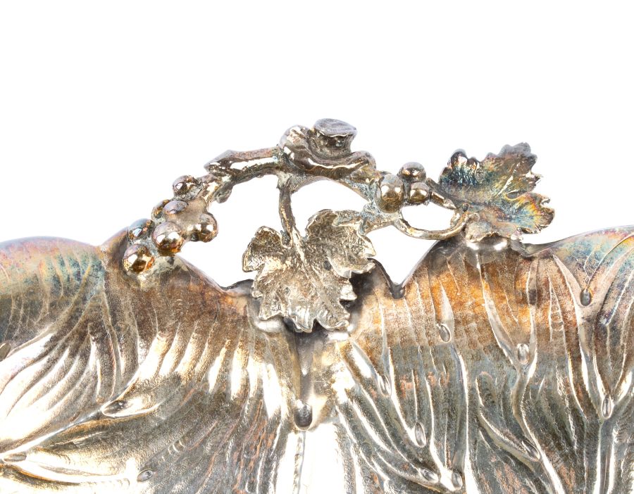Altezza x larghezza x profondità: 5,5 x 29 x 23 cm. Peso complessivo: 388 gr. Altezza x larghezza x profondità: 5,5 x 29 x 23 cm. Peso complessivo: 388 gr. a forma di foglia, poggiante su tre piedini decorati a motivi vegetali.