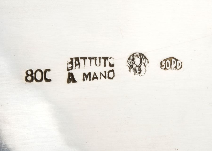 Argento 800/1000, punzonati "800 - BATTUTO A MANO - 30 PD", argentieri F.LLI ZARAMELLA BRUNO E CESARE.