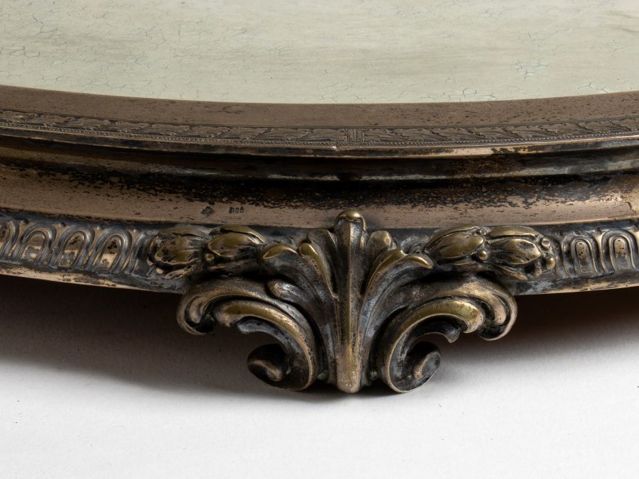 Altezza x larghezza x profondità: 7 x 84 x 50 cm Altezza x larghezza x profondità: 7 x 84 x 50 cm centrotavola con bordo in argento 800/1000 e specchio centrale.