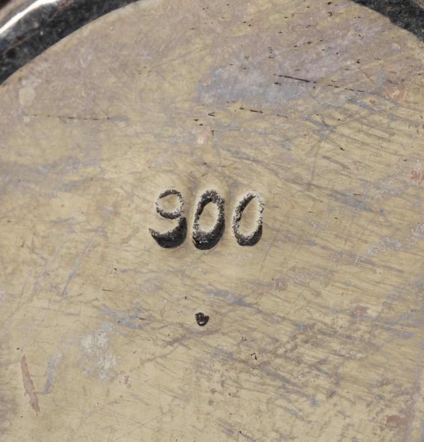 Altezza x diametro: 7 x 5 cm. Peso lordo complessivo: 60 gr. Altezza x diametro: 7 x 5 cm. Peso lordo complessivo: 60 gr. di forma bombata, sbalzate e cesellate con il motivo “Rose”, spesso indicato come “Baltimore Rose”.