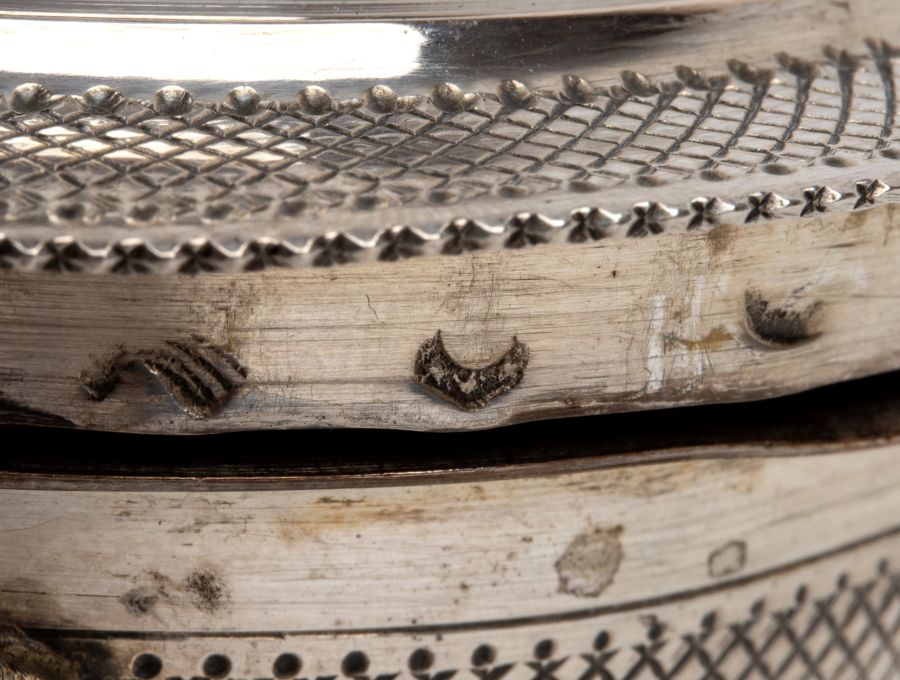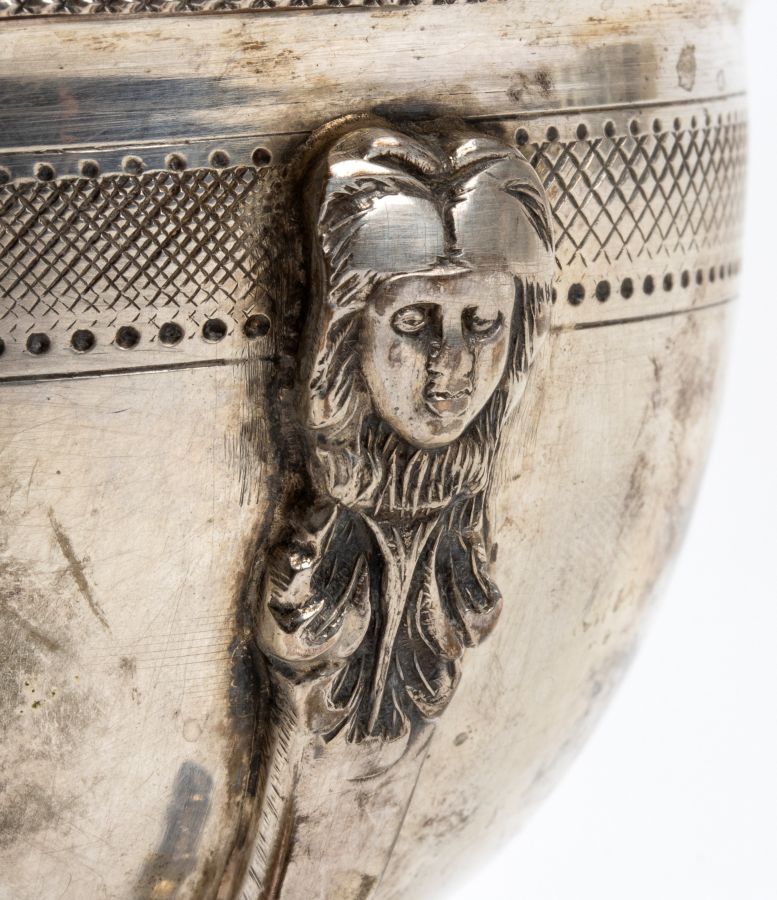 Altezza x diametro: 12,5 x 8 cm. Peso: 185 gr. Altezza x diametro: 12,5 x 8 cm. Peso: 185 gr. poggiante su tre piedini leonini stilizzati, di forma rotonda, decorata con motivi vegetali e geometrici, con presa a forma di ghianda.