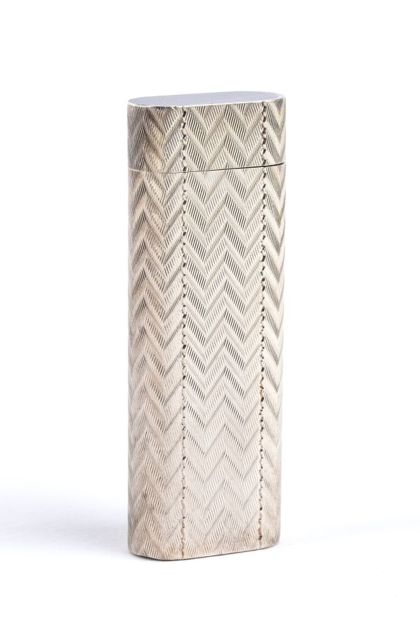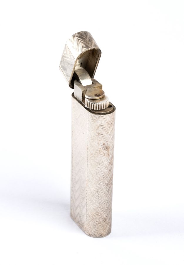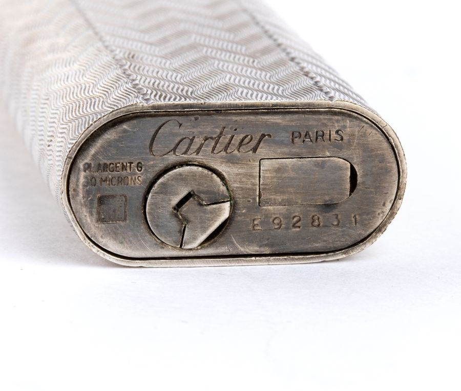 corpo satinato a motivi geometrici e placcato in argento. Seriale E92831. Firmato "CARTIER".