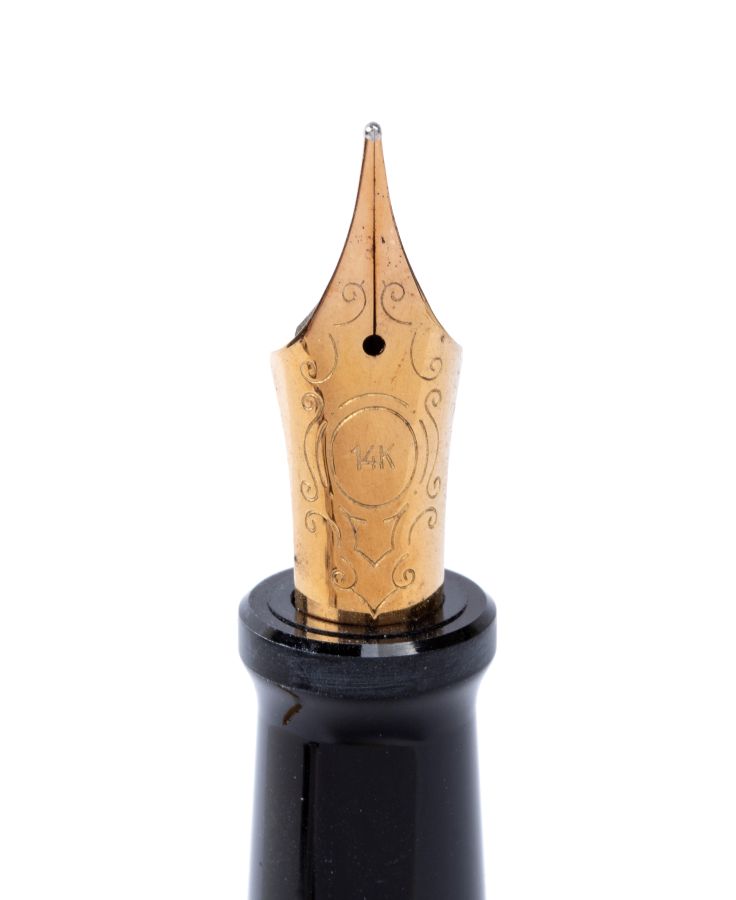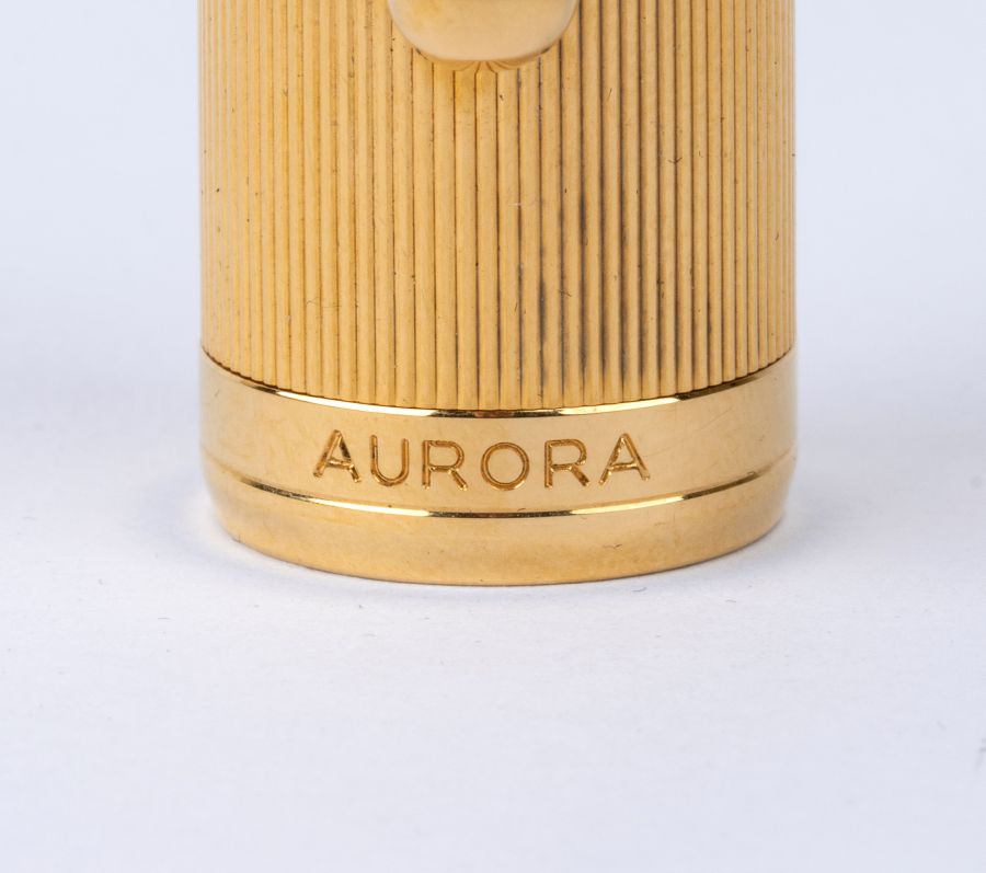 con caricamento a stanuffo, corpo e tappo laminati in oro e rastremati, pennino semicorazzato in oro 14k. Con scatola originale. Firmata AURORA.