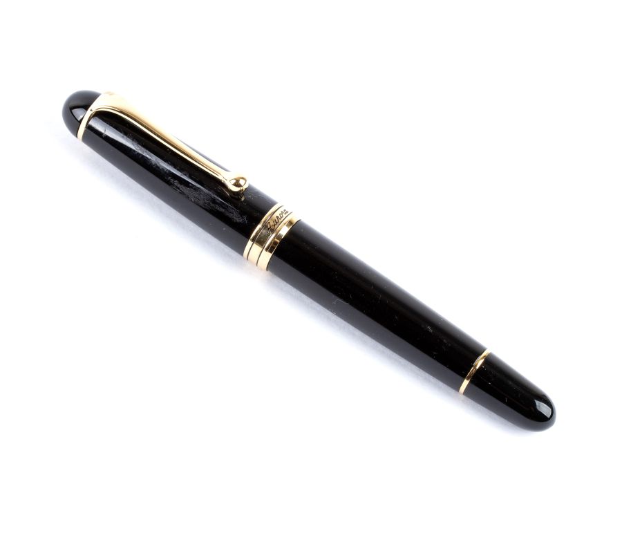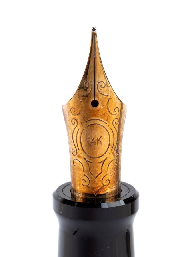 corpo e cappuccio in resina nera, pennino in oro 14k, dettagli dorati.