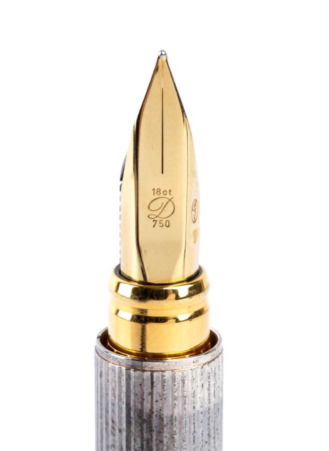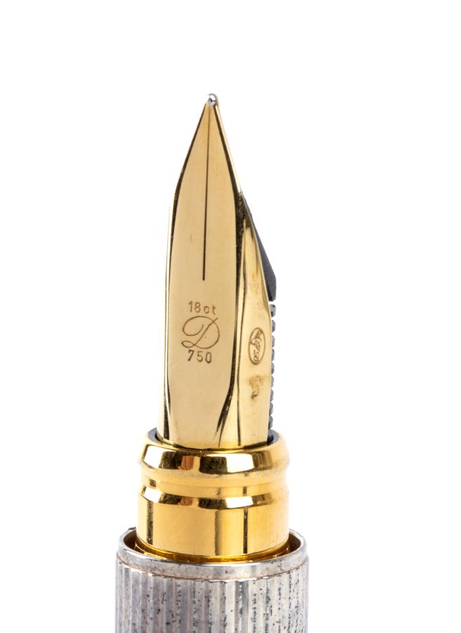 Lunghezza: 13,9 cm. Peso: 39,9 gr Lunghezza: 13,9 cm. Peso: 39,9 gr Ruotando il coperchio color argento, fuoriesce il pennino rodiato in oro 18k riportante la dicitura 18K - 750 - logo "D". Numero seriale 52BCR83. Sul tappo presenta la scritta "SJDupont, Pars".