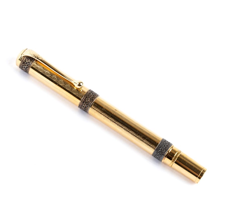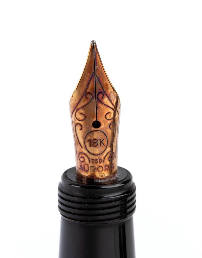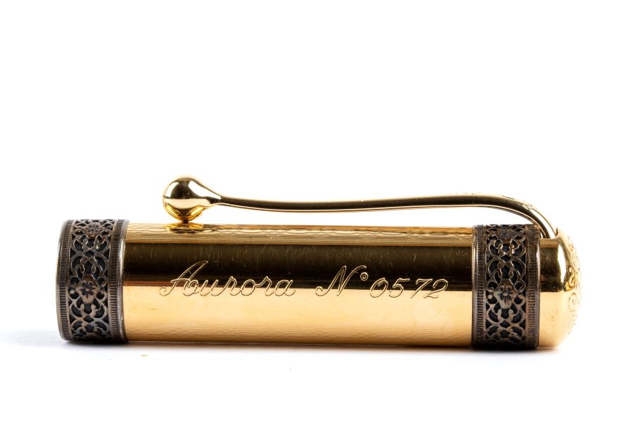 fusto e cappuccio laminati, riportante la scritta AURORA, oro decorati con gruppi di rombi longitudinali, pennino in oro 18k.