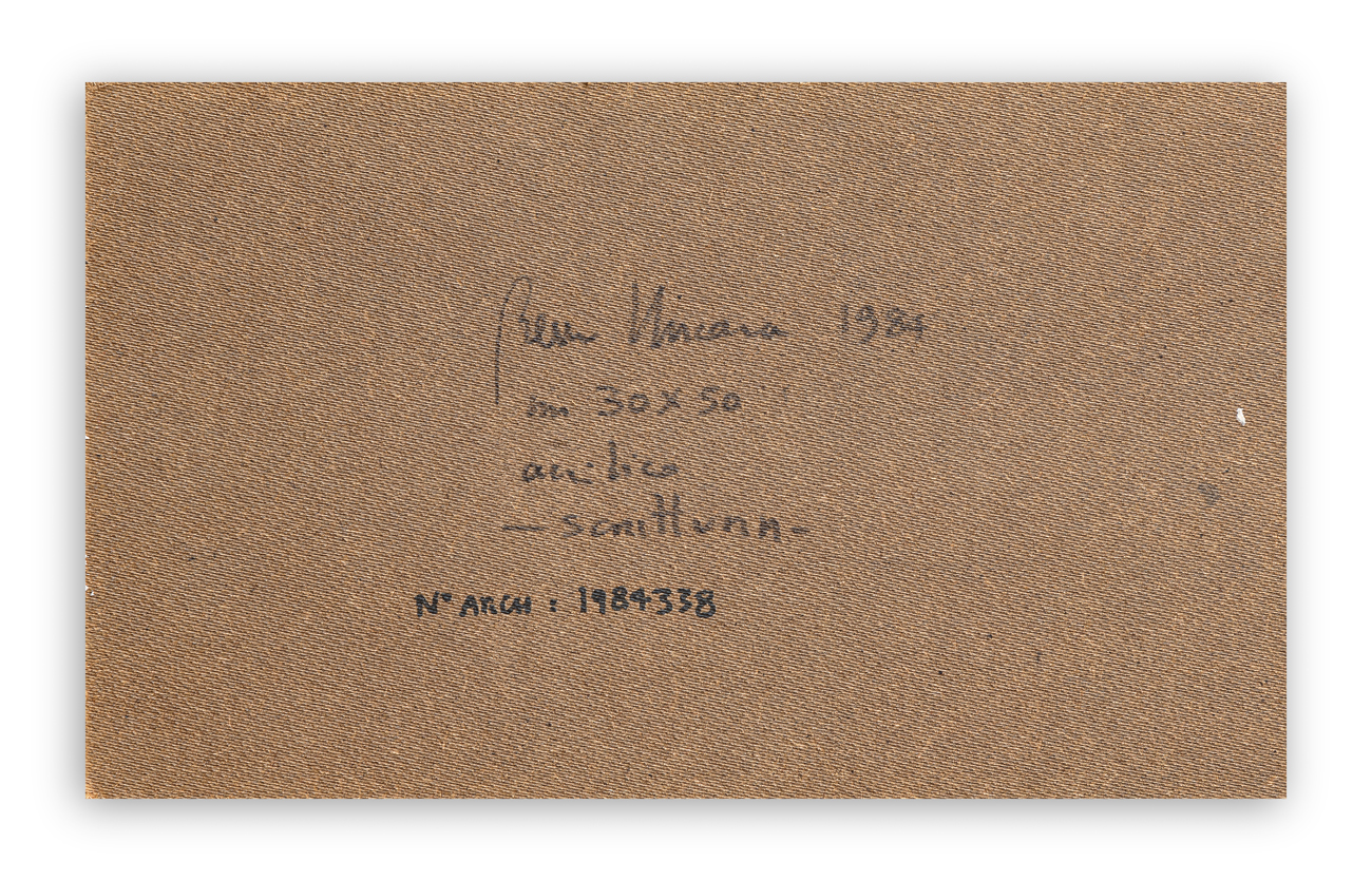 Firma, titolo, datazione , tecnica, misure e numero di archivio al retro