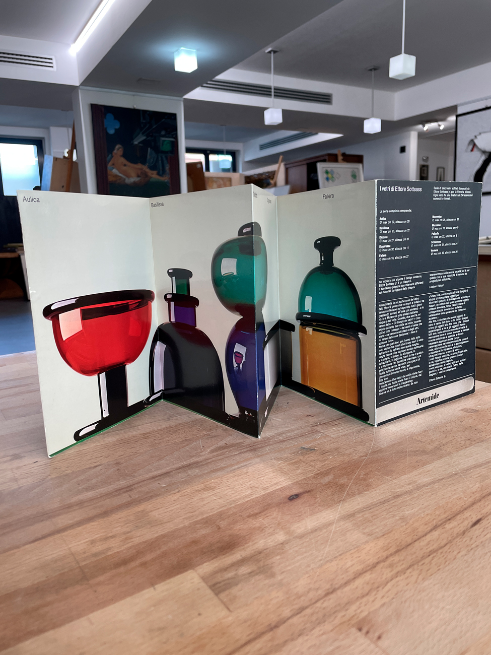 Pieghevole leporello illustrato, recante le immagini di 10 vetri soffiati disegnati da Ettore Sottsass jr. per la Vetreria Vistosi
