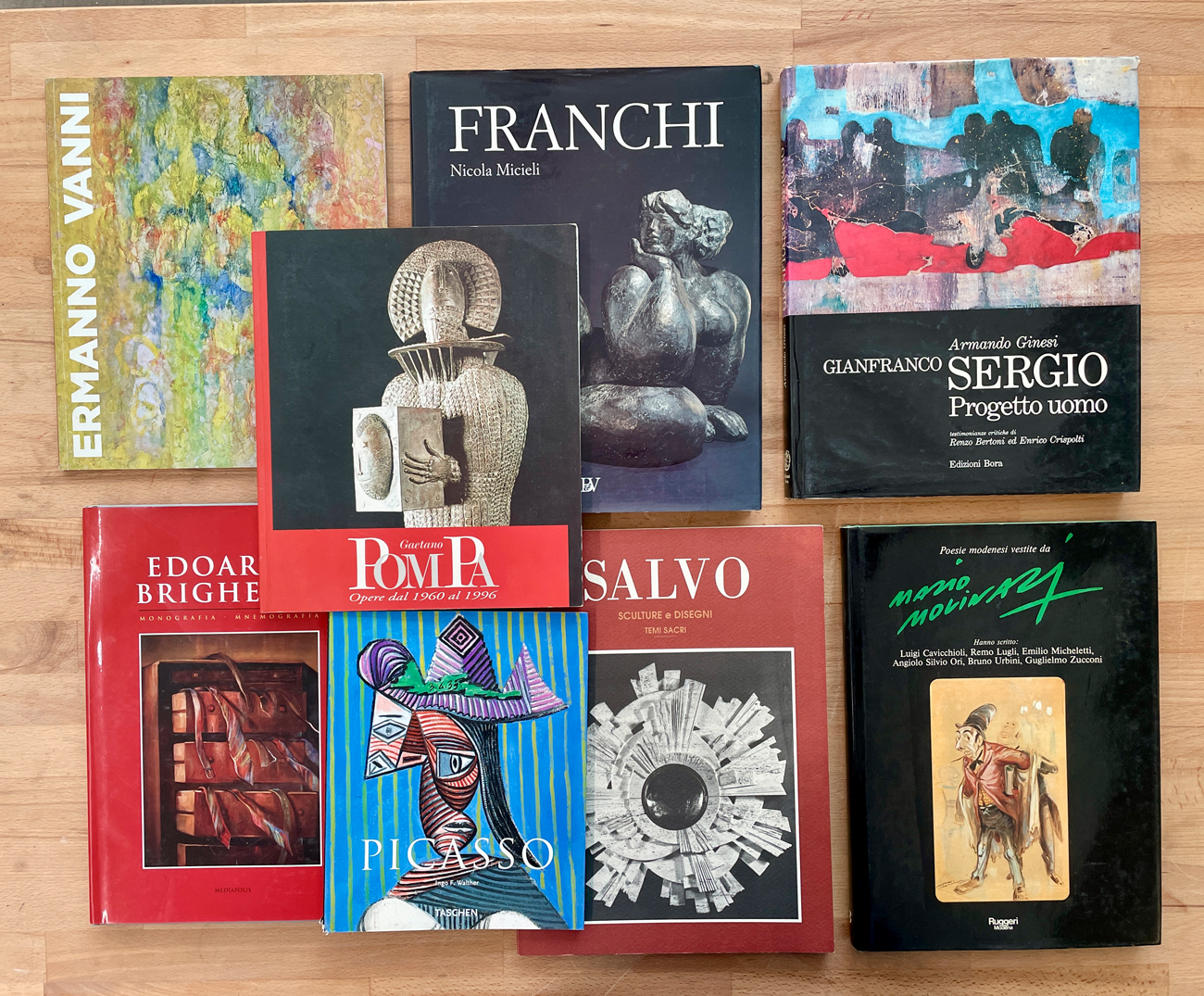 Lotto unico di 8 cataloghi relativi a esposizioni personali dei seguenti artisti: Franco Franchi, Gianfranco Sergio, Ermanno Vanni, Mario Molinari, Gaetano Pompa, Salvatore Bennardello (Salvo), Edoardo Brighenti e Pablo Picasso