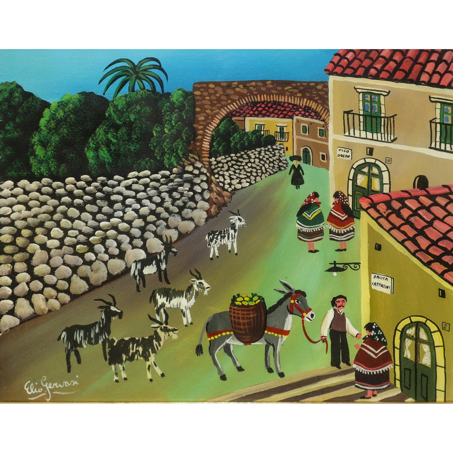 Elio Gervasi (XX secolo) - Contadino con asino e capre, 1983 h cm 30X35 in cornice 46X51 olio su legno Firmato in basso a sinistra. Firmato e datato sul retro
