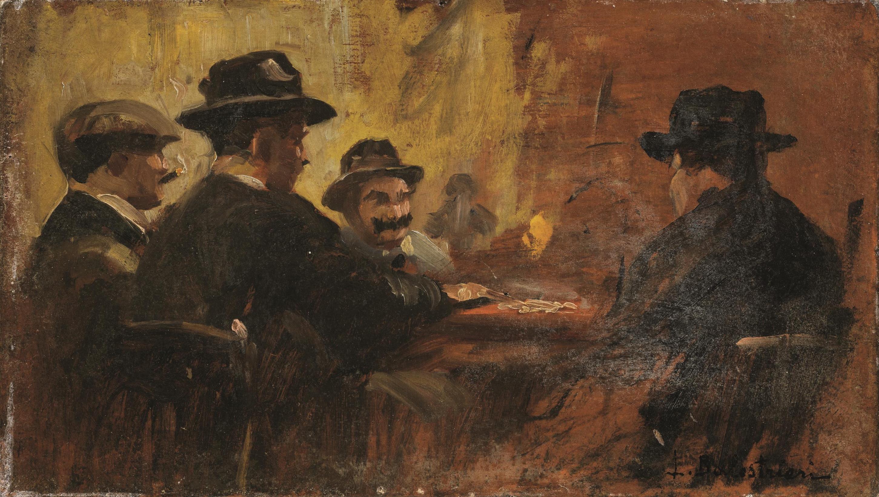 Lionello Balestrieri(Siena 1872 - 1958)GIOCATORI DI CARTE olio su cartoncino,...